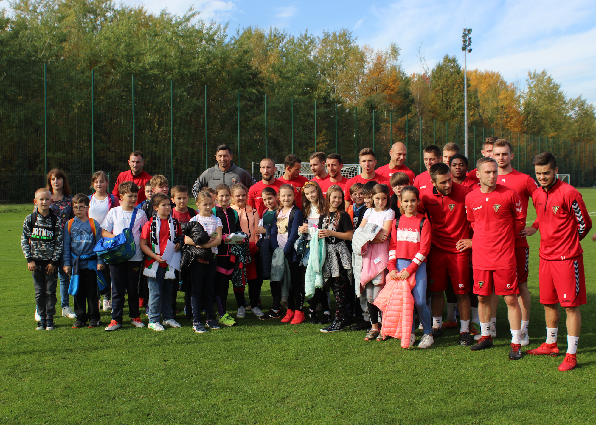 21 uczniów w towarzystwie wychowawczyni, Pani Gabrieli, oglądało zajęcia treningowe naszych piłkarzy. Dzieciaki same także kopały piłkę na sąsiednim boisku, a po treningu było zbieranie autografów i wspólna fotka.