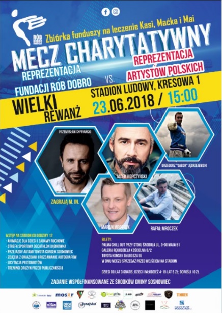 W imieniu Fundacji Rób Dobro serdecznie zapraszamy na Mecz Charytatywny Reprezentacji Artystów Polskich i Drużyny Fundacji Rób Dobro, który odbędzie się 23 czerwca przy ul. Kresowej 1. Mecz ma na celu pomoc dla Kasi, która ma 20 miesięcy, 8-letniemu Maćkowi i szesnastoletniej Mai. Dzieci mają szansę na lepsze jutro, lecz potrzebują naszego wsparcia. Na pomoc rusza Zagłębie, grono sponsorów jak i polskich artystów. Wśród gwiazd, które spotkamy na naszym obiekcie są m.in. Przemysław Cypryański, Jarosław Jakimowicz, Rafał i Marcin Mroczek, Maciej Florek, Jacek Kopczyński, Bilguun Ariunbaatar.
