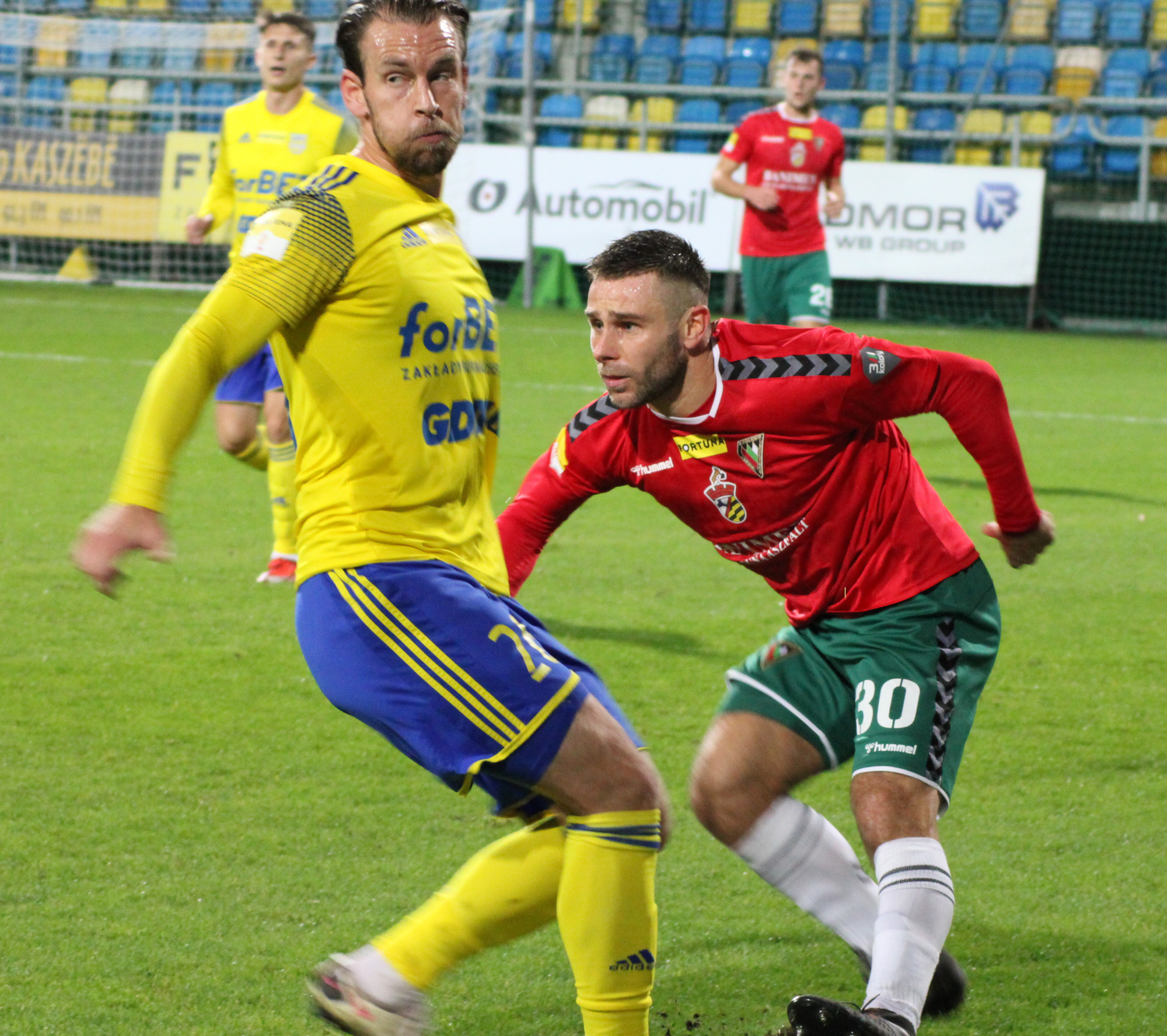 54' Po rzucie rożnym Filip Karbowy ograł zwodem jednego z rywali i oddał mocny strzał na bramkę Arki. Piłka trafiła jednak w Adama Dancha i wyszła na rzut rożny.