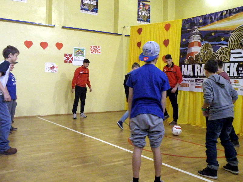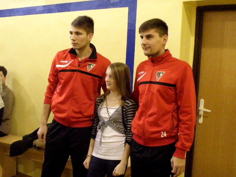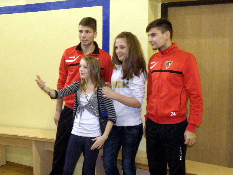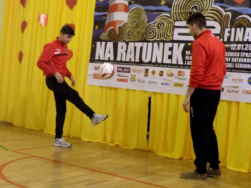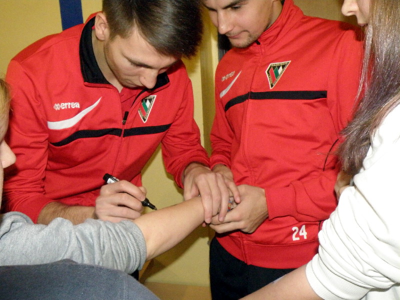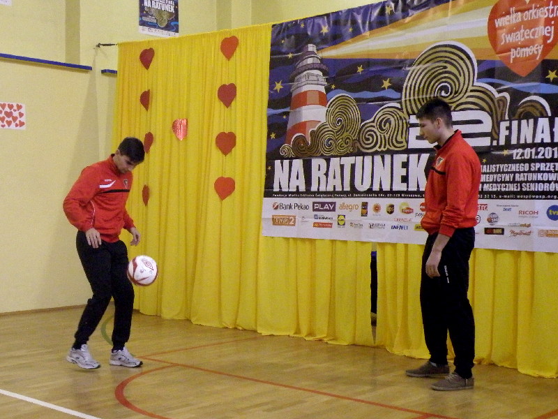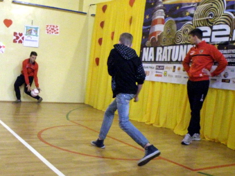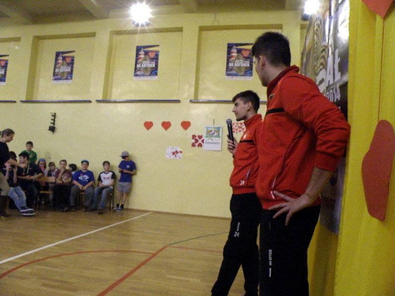 Oczywiście nasi zawodnicy na sam koniec zostali otoczeni przez uczniów i rozdali kilkanaście autografów, a także pozowali do zdjęć. Warto tutaj dodać, że po krótkim pokazie naszych zawodników, jeden z uczniów zaprezentował niebywałą technikę i niczym swego czasu David Beckham podrzucił sobie piłkę, złapał ją na łączeniu karku z plecami, a następnie nie zrzucając piłki na parkiet ściągnął koszulkę, za co oczywiście został nagrodzony brawami. - Byliśmy pod ogromnym wrażeniem umiejętności - mówił rozbawiony Dawid Weis. - Zawsze jest nam miło, gdy jesteśmy zapraszani na takie imprezy, w szczególności, że tutaj mogliśmy pomóc w zbieraniu pieniążków na WOŚP -dodał Paweł Grzywa.